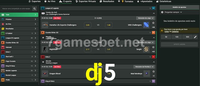 O dj5 oferece uma grande seleção de opções de apostas em e-sports com probabilidades competitivas